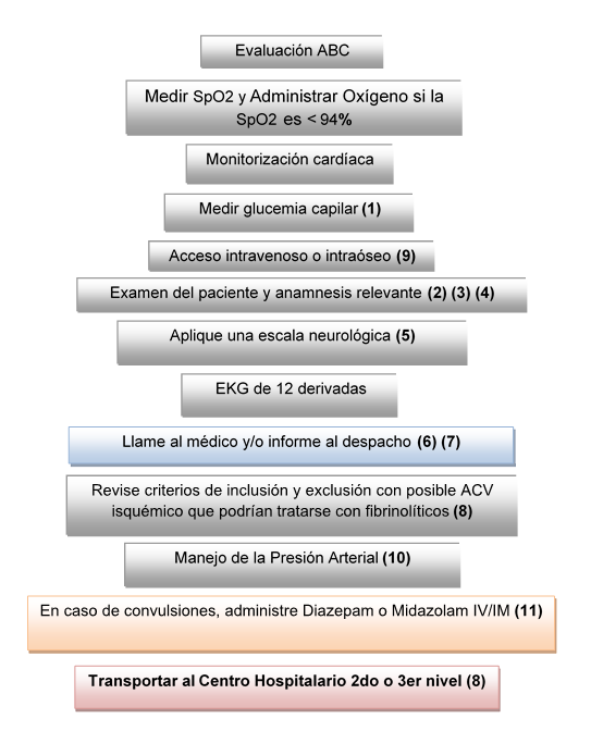 - Considerar el uso de Labetalol en los casos donde la presión arterial sea mayor. Si se sospecha de un ACV ya sea isquémico o hemorrágico con una presión sistólica ≥ 220 o presión diastólica >120mmHg se considera colocar el Labetalol 10mg IV/IO durante 1 – 2 minutos, se puede considerar una segunda dosis a los 10 minutos.