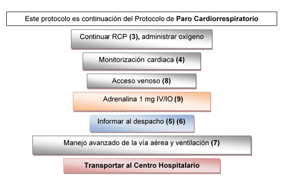 - Durante el Paro Cardiorrespiratorio, los medicamentos administrados por vía intravenosa periférica, deben ser administrados por bolos, seguidos de un bolo de 20 cc de líquido Intravenoso (SSN/Agua Bidestilada/otros) y elevar la extremidad durante 10 a 20 segundos desde la aplicación del medicamento.