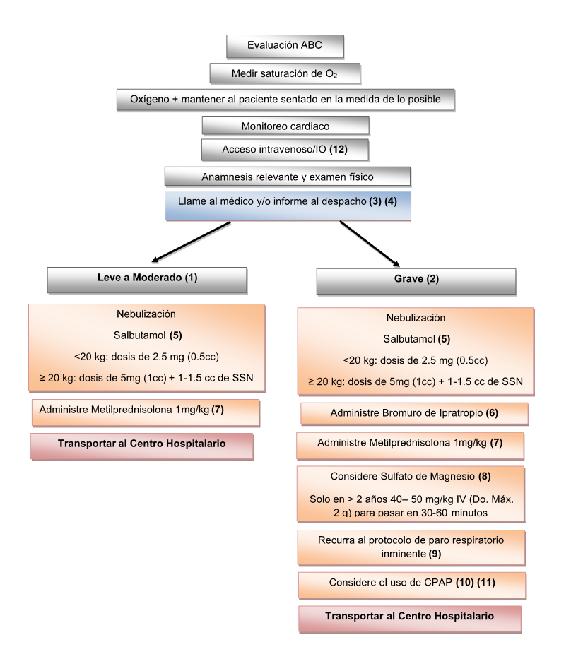 - Inicie tratamiento antes del traslado del paciente. No se brindará tratamiento de asma en casa. Pueden repetirse las inhalaciones de Salbutamol exclusivamente cada 20 minutos.