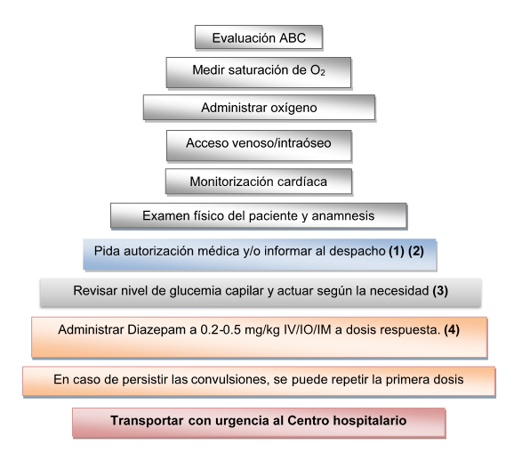 - En ausencia de Diazepam se puede administrar Midazolam 0.1 – 0.3mg/kg IV/IO/IM. Dosis máxima 10mg.