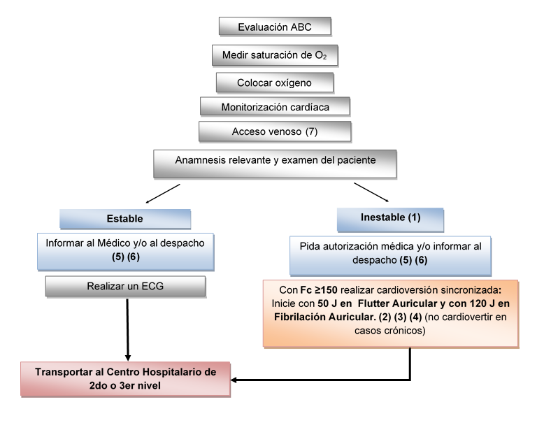 (1) Paciente inestable: infarto agudo de miocardio o dolor torácico de origen cardíaco, insuficiencia cardíaca aguda / edema agudo pulmonar, alteración del estado de consciencia, presión sistólica por debajo de 90mmHg, signos de shock.