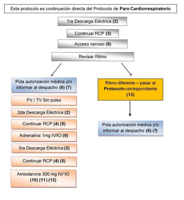 (13) Si el ritmo es organizado y existe pulso palpable proceda con el protocolo de Cuidados Post paro Cardiorrespiratorio. Si el ritmo no es desfibrilable y no existe pulso proceda con el protocolo de Asistolia/AESP.