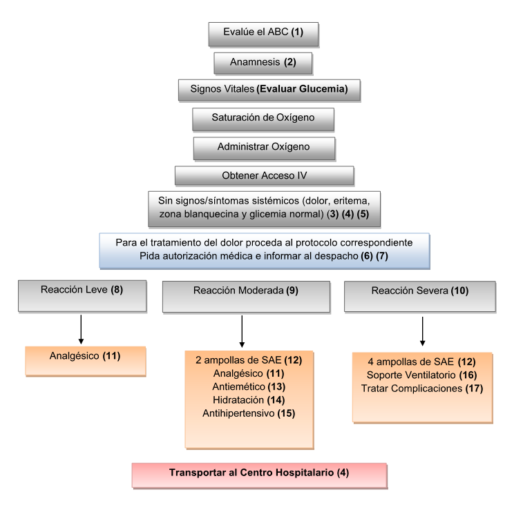 (1) Es importante verificar que el paciente está fuera del área donde fue picado; prepararse para acciones de soporte avanzado para la vida.