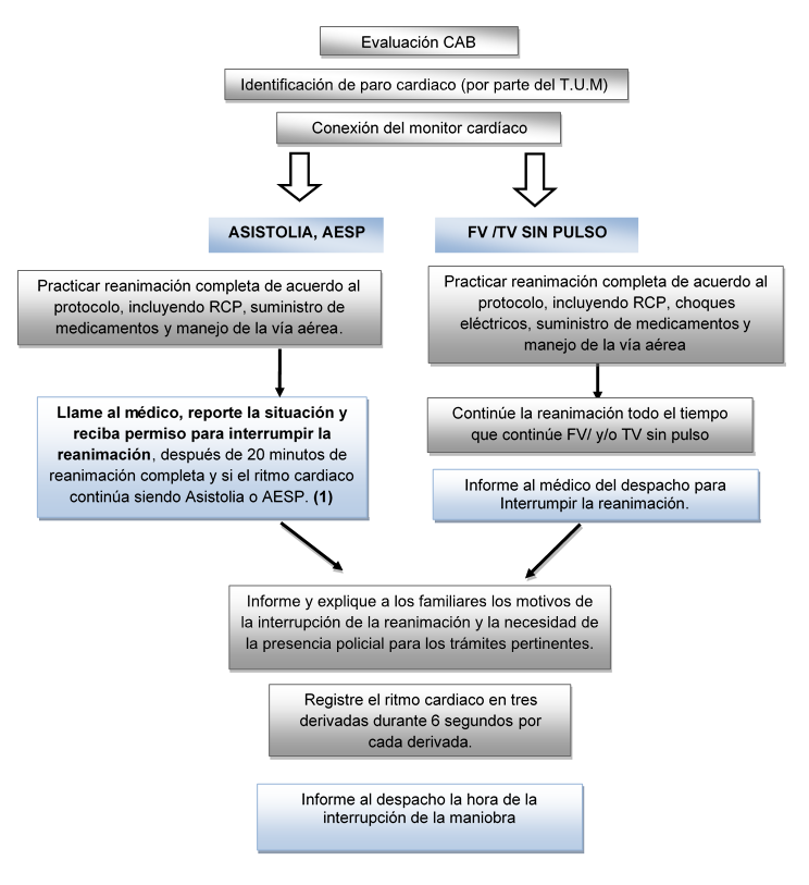 - De acuerdo con el protocolo, el TUM interrumpirá las maniobras de reanimación previa autorización médica. En las áreas donde no haya cobertura de señal telefónica ni vía radio, debe proceder con el protocolo adecuado a la situación, documentar y/o comunicar al médico del despacho en cuanto se tenga comunicación.