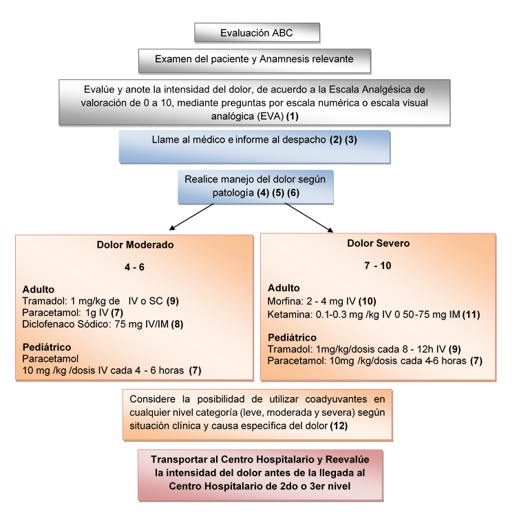 - Dolor asociado a trauma: Para el manejo del dolor en pacientes con un trauma específico recurra al Protocolo correspondiente de trauma. Se incluye manejo del dolor asociado a traumas relacionados accidentes de tránsito, caídas, sospecha de fractura y luxaciones.