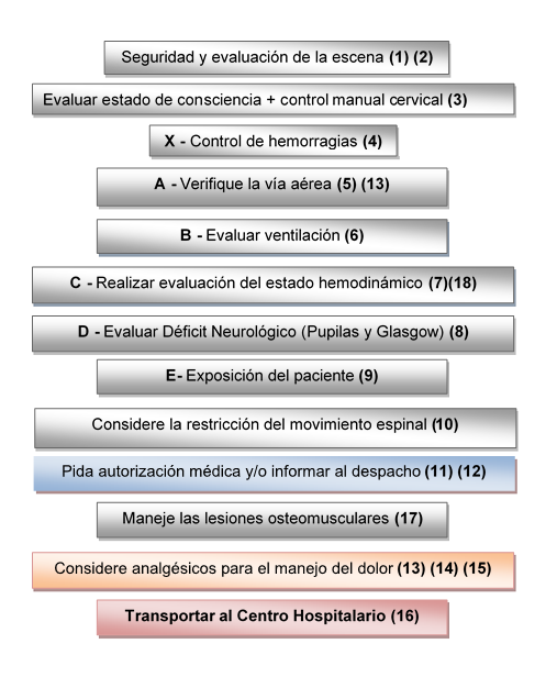 (2) Si son múltiples víctimas, para priorizar la atención, activar el sistema de comando incidente, utilice el sistema de Triage START para pacientes adultos y el JUMPSTART para pacientes pediátricos.