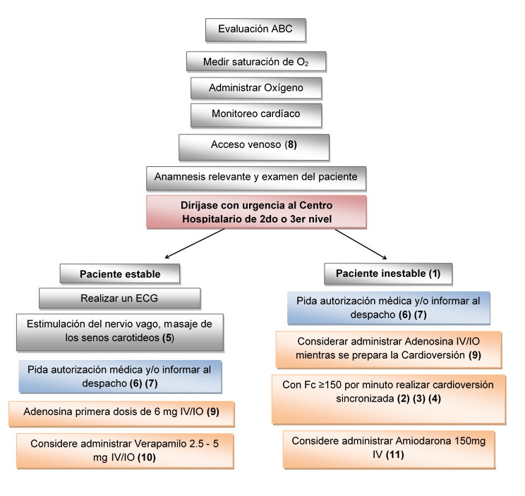 (1) Paciente inestable: infarto agudo de miocardio o dolor torácico de origen cardíaco, insuficiencia cardíaca congestiva severa / edema agudo pulmonar, alteración del estado de consciencia, presión sistólica < de 90mmHg, signos de shock.