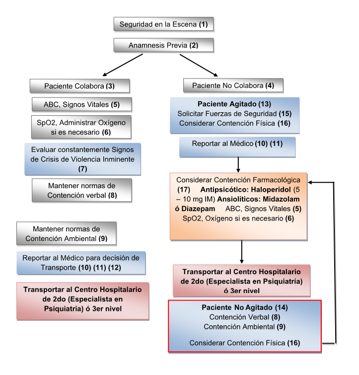 (1) Evaluar indicios de escena insegura: objetos punzocortantes, paciente agresivo y/o armado, solicitar apoyo de fuerzas de seguridad, acudir a escena con familiares del paciente que no empeoren el cuadro clínico con su presencia. Si la escena es insegura para la integridad física del personal de Salud, considerar abortar la atención del paciente (Firma de HDA y destacar lo sucedido).